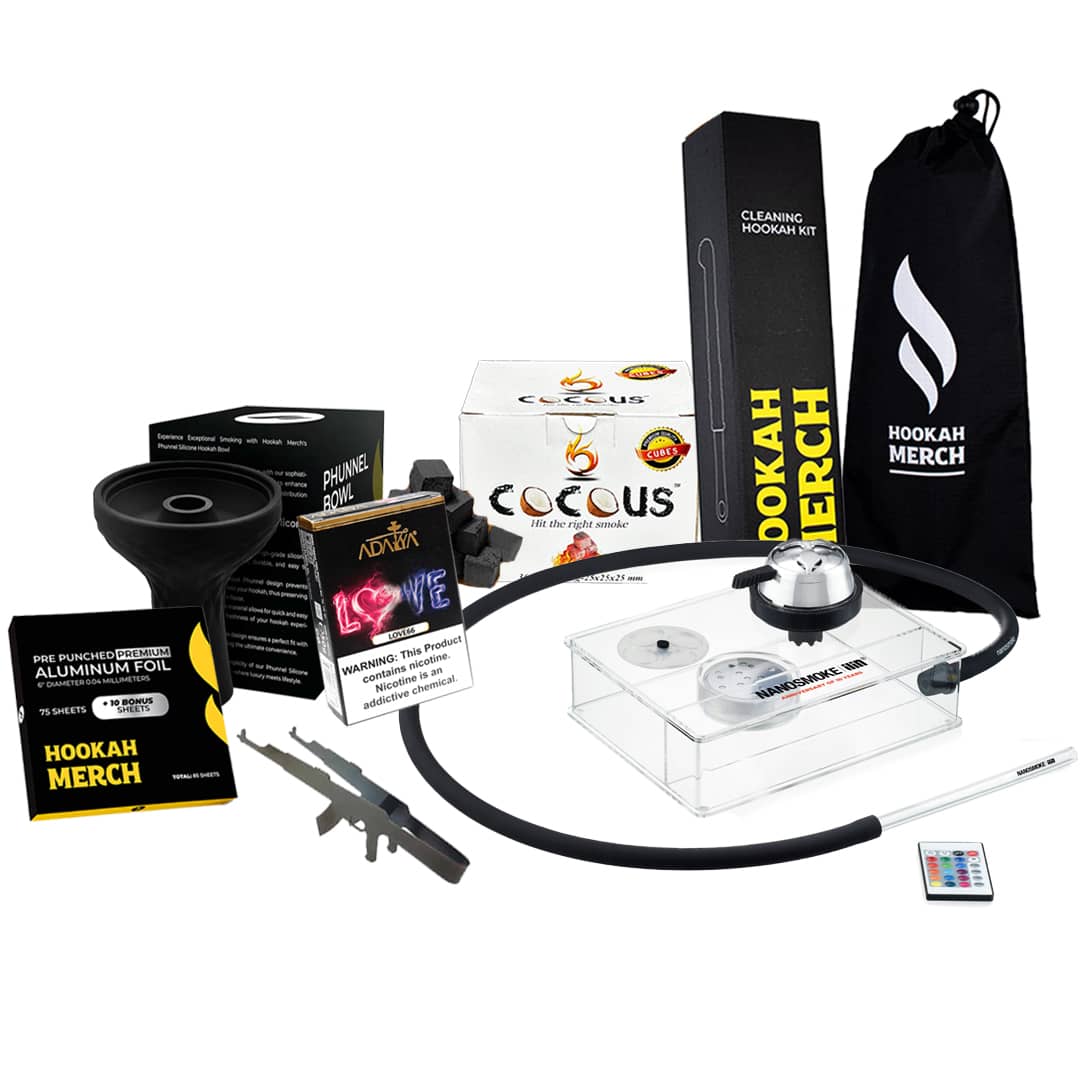 Introducing the Nano Smoke Cube Full Hookah Kit, a paradigm of modernity and efficiency for those who appreciate the finer aspects of the hookah smoking experience. This comprehensive kit comes with everything required for a standout session, featuring the cutting-edge 2.5″ Nano Smoke Cube Hookah, celebrated for its minimalist design and unparalleled performance.What's Included in the Kit?